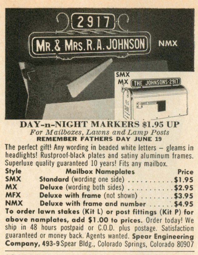 The March 1966 issue of Better Homes and Garden had a Spear Engineering ad for mailbox markers, where a modern mailbox was in the background and the Joroleman tunnel shaped design was an inset!
