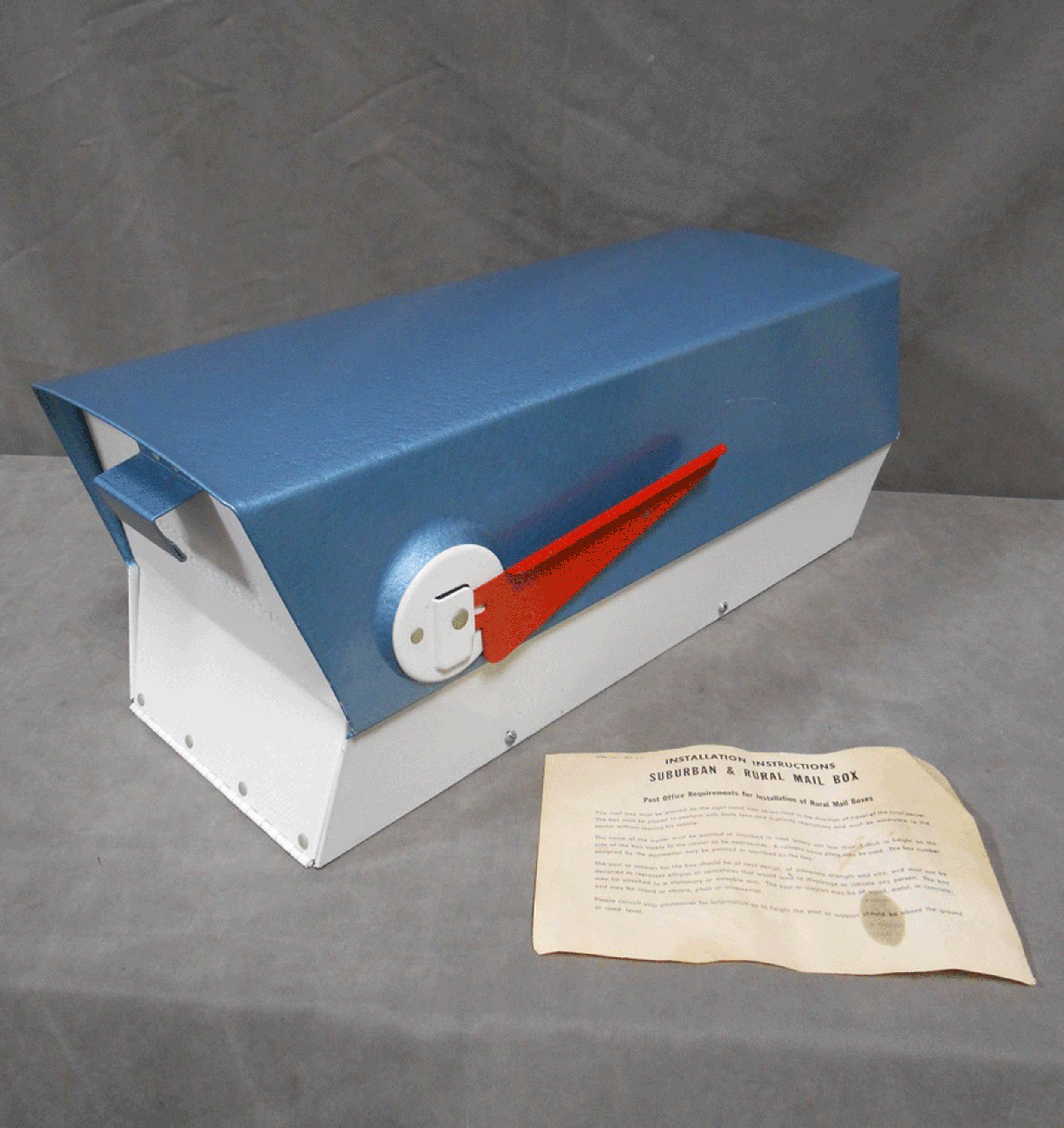 The mailbox had some scratches and scrapes. The seller did not think it had ever been used. The original instruction sheet was included. Per the posted photos, the back of the mailbox was stamped with a “9 72” just below the manufacture’s name, leading me to believe it was made in 1972. Makes sense.