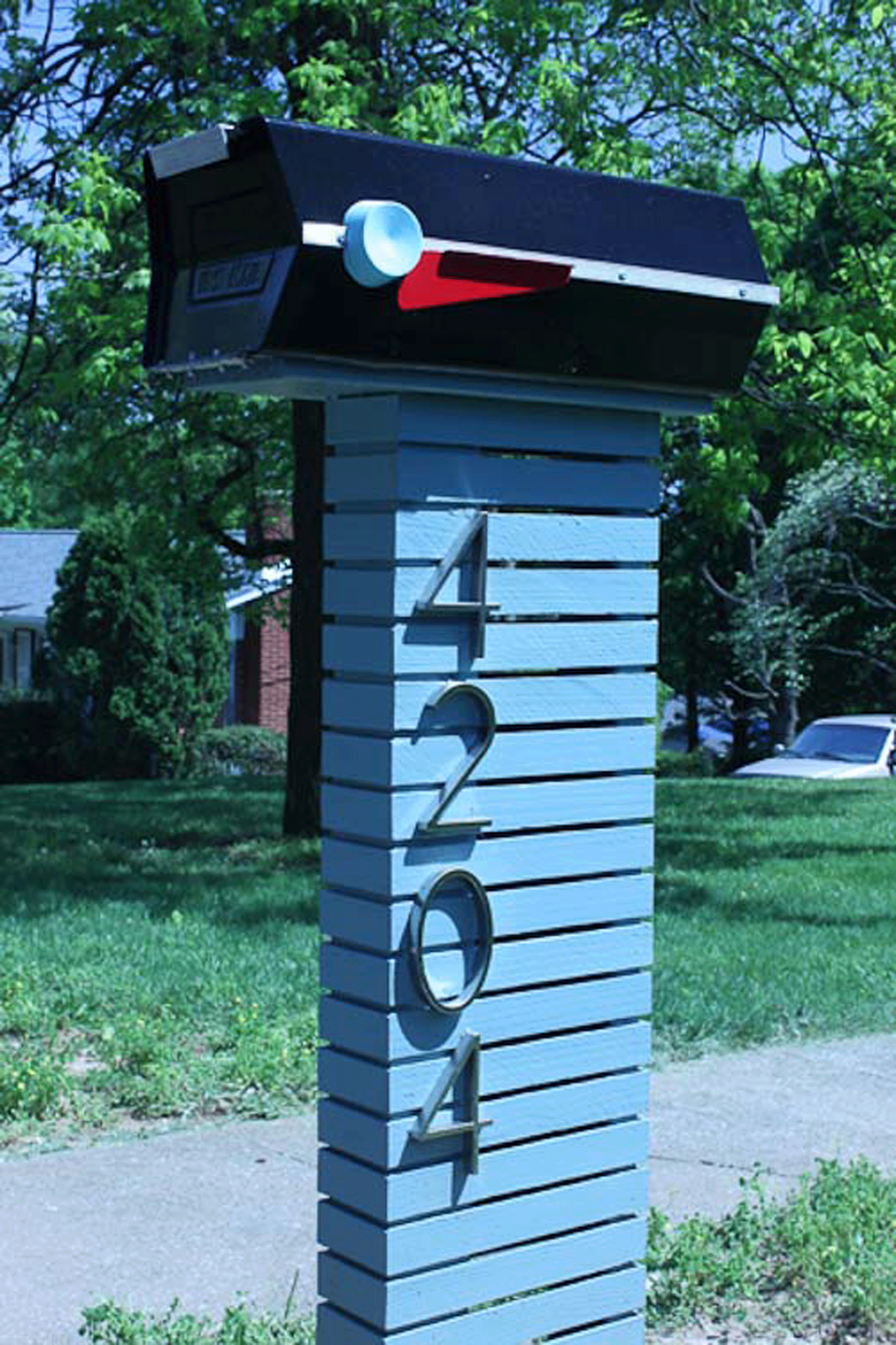 Per the post, here is what Jim had to say about the mailbox: Here is our Atomic Mailbox. 1950s Sear Roebuck Co.! It has a solid fuel booster and was part of the original Mercury program. 3-2-1 lift off! …A few months ago our mailbox got run over. So I started looking for a new stylish mailbox. Oh you can find stylish mailboxes but you are gonna pay an arm and a leg for them. And of course I can’t be satisfied with a run of the mill mailbox. (It’s like a sickness.) So I hunted down a cool 1950s era mailbox. It needed some love so I spent a couple weeks cleaning it up and painting it. I built the post and we found the numbers at the local big box store.