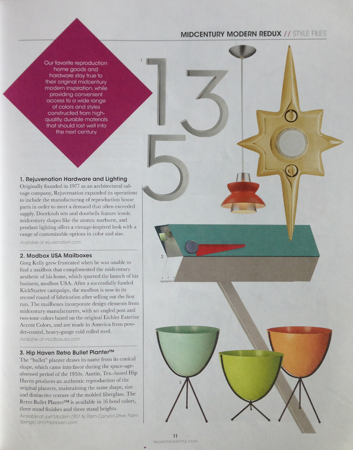 The popular Palm Springs Style website’s Premiere Issue of Palm Springs Style magazine was published during Palm Springs’ Modernism Week. In late 2014, the magazine’s Editor-in-Chief, Katy Carrier contacted me stating “we would love to feature modbox in our first print issue…”