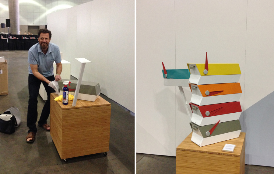 In mid March the dwell \store\ started carrying the modbox retro mid-century modern mailbox. We were fortunate that the dwell folks invited us to attend Dwell on Design LA as guests with the modbox on display at the dwell pop-up store! Here is a photo of the display we had constructed and shipped out to LA with mailboxes inside.